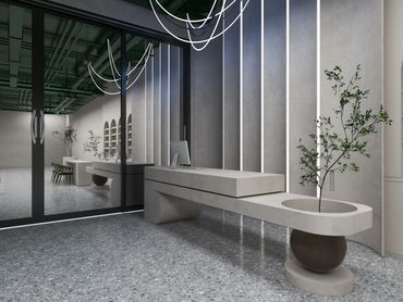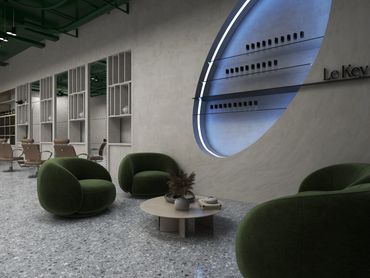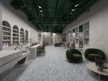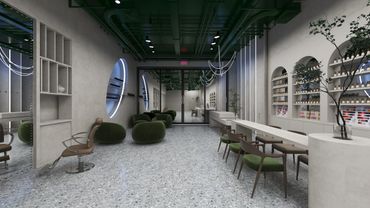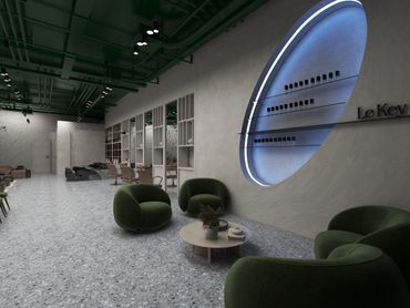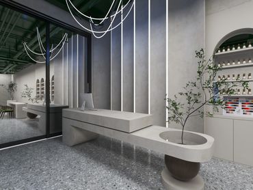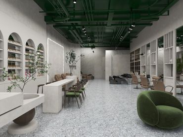 We provided a conceptual eDesign for this organic Wabi-Sabi salon, featuring Terrazzo tile flooring, lime-wash wall finishes, natural wood accents, lush greenery, soft ambient lighting, and a serene, nature-inspired, calming, and inviting workspace atmosphere.